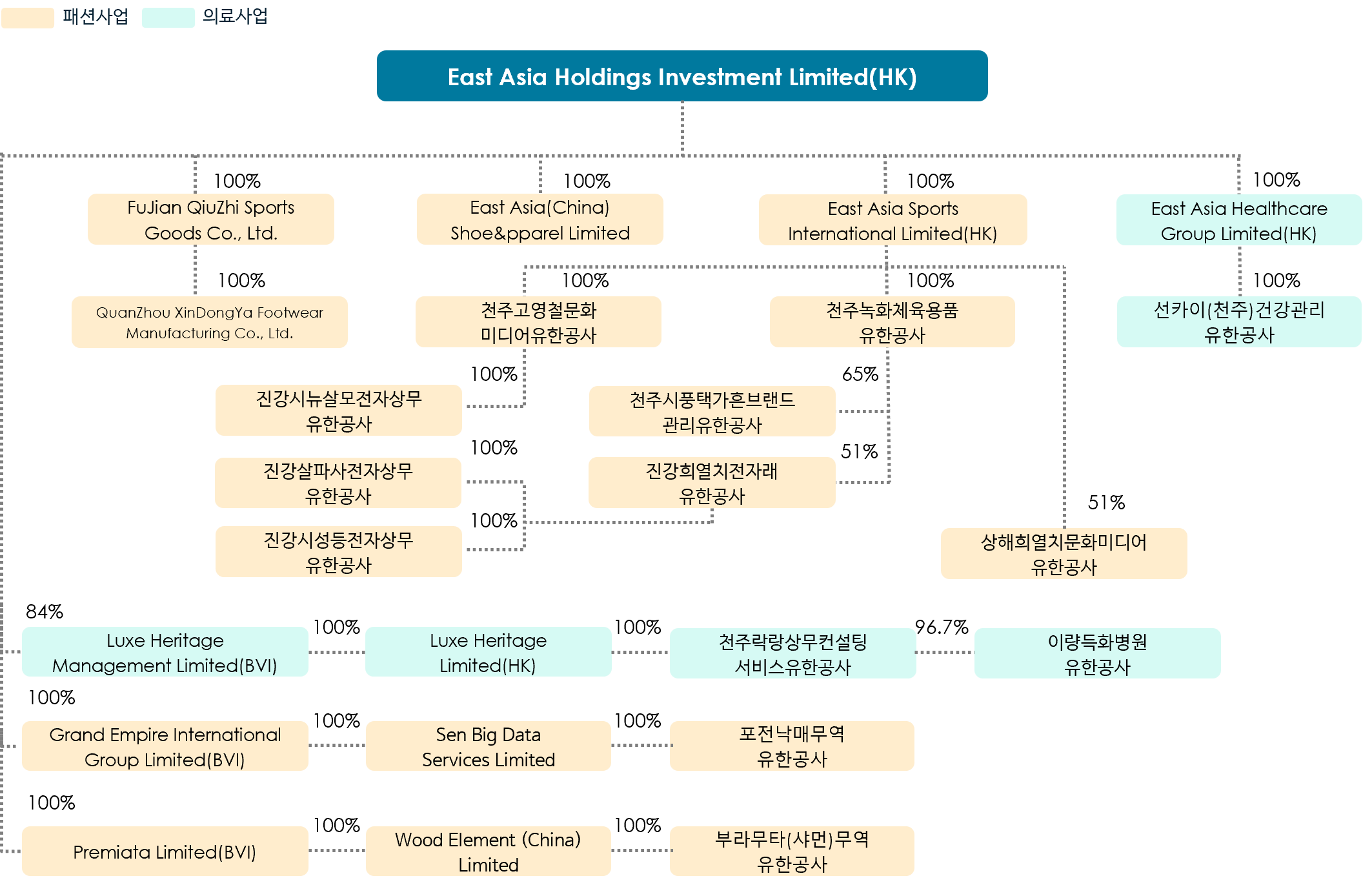 이스트아시아홀딩스인베스트먼트리미티드는 2009년에 설립된 순수 지주회사로서 4개의 자회사와 3개의 손자회사를 보유하는 있습니다. 당사는 패션 브랜드 운영 사업과 헬스케어 사업을 영위하고 있습니다.